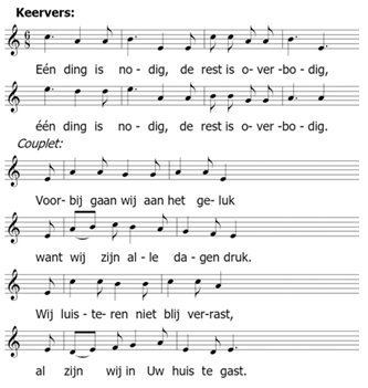 zondag 20 juli 2025 om 10:00 uurMorgendienstVoorganger(s): ds. C. vd Meij uit Voorschoten Welkom: door de ouderling van dienst Ochtendlied: Lied 216 Bemoediging en groet Onze hulp is in de naam van de Heer Die hemel en aarde gemaakt heeft Die trouw blijft tot in eeuwigheid En nooit loslaat het werk dat zijn hand begon. Genade en vrede voor u, van God onze Vader Door onze Heer Jezus Christus In de gemeenschap met de Heilige Geest. Amen. Zingen: Psalm 119: 1 en 2 Voor de kinderen Kinderlied: Maria en Martha (uit: Hanna Lam, Alles wordt nieuw III, 13) ![]() 2 Maria koos het goede deel maar wij, wij haasten ons te veel. Zij kwam op adem door Uw woord. Maar Martha heeft het niet gehoord. 3 Zij had voor U geen open oor, daar was zij veel te bezig voor. Achter haar zorgen liep zij aan en had geen tijd om stil te staan. 4 Wij komen niet op ons verhaal wanneer wij doof zijn voor Uw taal. al zijn wij alle dagen druk; Uw woord alleen brengt ons geluk. Gebed om ontferming Glorialied: Lied 869: 1 en 3 Gebed Lezing: Deuteronomium 33: 2 en 3 Zingen: Lied 319: 1, 2, 5 en 7 Lezing: Lucas 10: 38-42 Zingen: Lied 824 Verkondiging Zingen: Lied 837: 1 en 4 Dankgebed en voorbeden – stilte – Onze Vader (Mattheus 6: 9 t/m 13) Mededelingen Collecte Slotlied: Lied 825: 1 en 5 Zegen afgesloten met gezongen Amen |